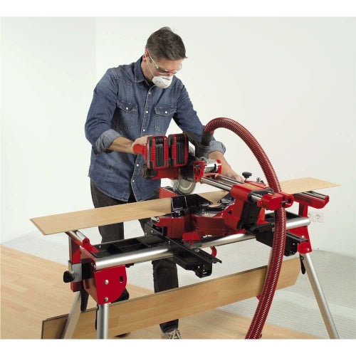 - Saw head tilts to the left and right for mitre cutting