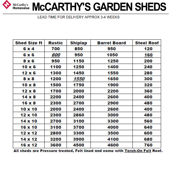 All sheds are made to order, come with felt lining on the inner wall and are made of fully pressure treated timber with torch on felt roof as standard. Top Quality workmanship guaranteed!